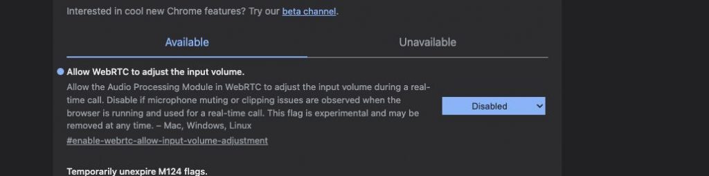 - Search for “Allow WebRTC to adjust the input volume”